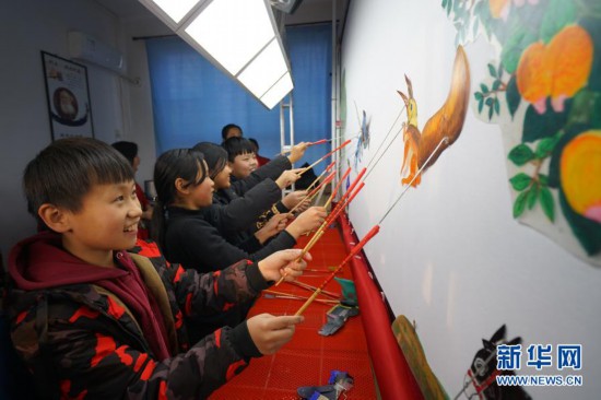 11月24日,河北省沙河市西油村小學(xué)學(xué)生在練習(xí)表演皮影戲。