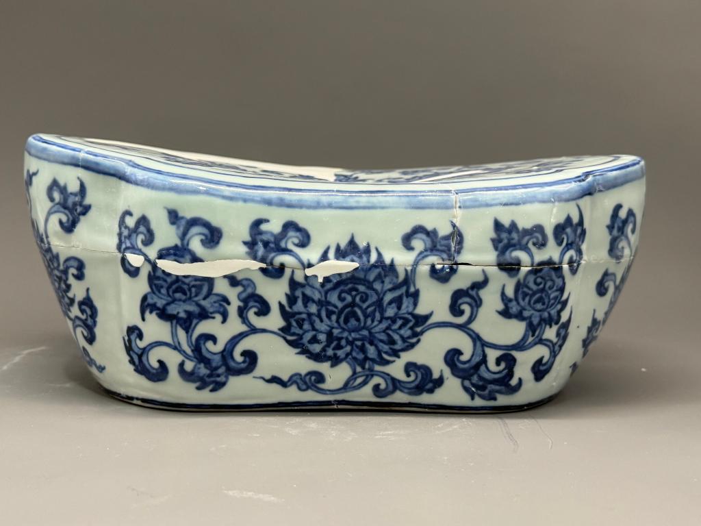 修復(fù)后的瓷枕器形一致,大小在長31.5厘米、寬23厘米、高12.3厘米左右。枕呈如意頭形,中空、枕面微凹、平底。枕面邊沿隨枕形勾勒雙線邊飾,其內(nèi)繪青花花卉紋飾,側(cè)壁亦繪青花花卉紋飾。外底中間銅錢紋,以作排氣用。