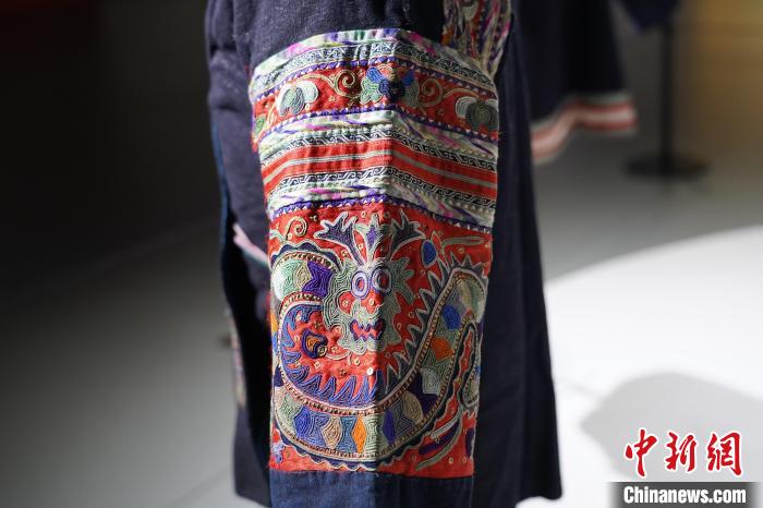 圖為展品侗族服飾上龍紋刺繡。中新社記者 蒲文思 攝