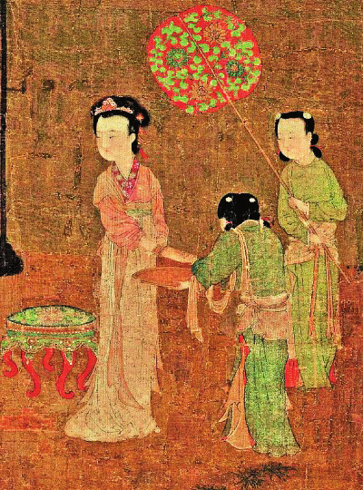 宋代女性服飾重神韻。宋代女性清秀也好,婉約也罷,臉部神態(tài)往往離不開妝容。于眉目之間,便有“都緣自有離恨,故畫作遠山長”“倒暈工夫,畫得宮眉巧”;于臉頰之間,便有“嫩臉修蛾,淡勻輕掃”“淺拂胭脂輕傅粉”之淡妝,亦有“近來因甚要濃妝,不管滿城桃杏妒”之濃妝;而于神情之間,便有“和羞走,倚門回首,卻把青梅嗅”“畫愁眉,遮語回輕扇,含羞下繡幃”。從妝容到神態(tài),刻畫了宋代女性神韻一隅。(徐雅琴)