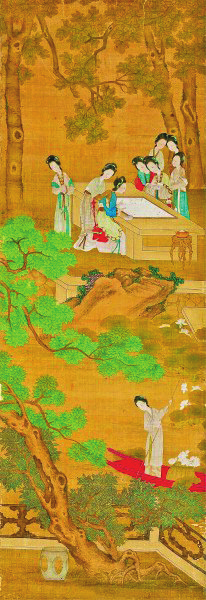 宋代畫作亦呈現(xiàn)女性服飾之濃郁色韻。畫作《女孝經(jīng)》中的女性穿著,有淡綠衫配淡紫裙、白衫配淡綠壓花裙、淡藍衫配淡黃裙等,披帛外搭相應(yīng)為淡藍、淡紫和淡黃,女性服色呈現(xiàn)出素淡搭配之主流。《瑤臺步月圖》為宋代畫家劉宗古創(chuàng)作,畫中女子裙子均為白色,衣著素淡簡樸,氣質(zhì)高雅脫俗。《盥手觀花圖》中服色搭配更為柔和,女主人上穿淡紫窄袖長襦,下穿白色長裙,外搭淡黃披帛;侍女穿淡綠袍衫搭淡黃腰間寬巾,亦有穿淡藍袍衫搭白色腰圍?!肚迕魃虾訄D》為中國古代著名繪畫,由畫家張擇端創(chuàng)作,畫中少有女性,普通勞動婦女多穿青色裙或腰系青花圍巾,有身份的女子戴蓋頭、穿紫色褙子,展現(xiàn)出簡約、素雅的宋代服飾風(fēng)格。