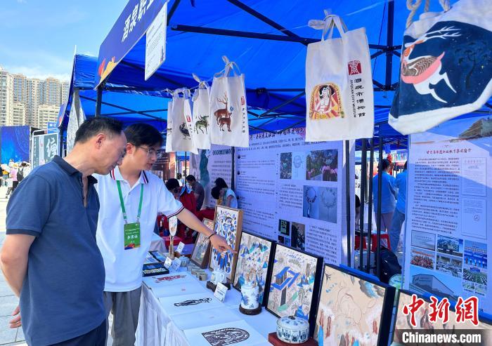 7月14日,酒泉職業(yè)技術學院學生王皓向觀眾介紹敦煌文創(chuàng)作品。中新社記者 丁思 攝 “我們喜歡潮流的新事物,也喜歡古老的優(yōu)秀傳統(tǒng)文化,敦煌文化是我最感興趣的?!?9歲的王皓是酒泉職業(yè)技術學院研學旅行管理與服務專業(yè)的學生,他告訴記者,要成為優(yōu)秀的研學導師,豐富的歷史理論和動手實踐能力必不可少,參加學校的非遺課堂,讓他收獲了這兩方面的知識。 王皓的導師是酒泉職業(yè)技術學院教授王權朝,他是甘肅省級非遺項目“敦煌石粉彩繪技藝”傳承人,依托敦煌剪紙、陶瓷釉下彩繪等非遺技藝,進行非遺創(chuàng)新設計,文創(chuàng)產(chǎn)品有茶具、團扇、背包、抱枕等。 王權朝的課還受到該校留學生歡迎,他收了不少“洋弟子”,為他們講述敦煌壁畫藝術相關課程,并進行敦煌壁畫白描、泥板畫等實操訓練。他告訴記者,今年他還開啟線上教學,錄制課程《敦煌壁畫藝術》,以通俗易懂的講解語言,直觀的圖片和操作視頻,讓海外觀眾不僅可以學習中文,還可以近距離感受敦煌藝術。