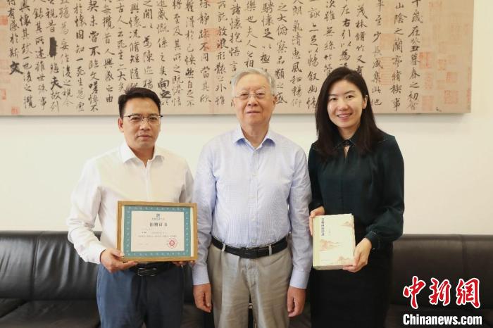 李紅強總編輯(左)代表人民文學(xué)出版社向國家圖書館捐贈《莫礪鋒演講錄》一種三冊,霍瑞娟副館長(右)代表國家圖書館接受捐贈并頒發(fā)證書。儀式后雙方與莫礪鋒教授(中)合影。 主辦方供圖
