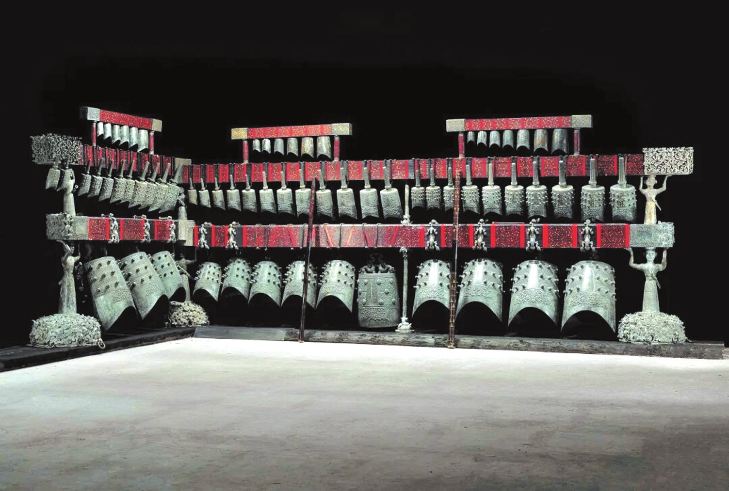 最具代表性的樂鐘無疑是“青銅之冠”的曾侯乙編鐘,它展現(xiàn)了先秦禮樂文明與青銅鑄造技術(shù)的最高成就。曾侯乙編鐘是戰(zhàn)國早期曾國國君的“禮樂重器”,1978年出土于今湖北隨州的曾侯乙墓,是迄今發(fā)現(xiàn)數(shù)量最多、保存最好、音律最全、氣勢最宏偉的一套編鐘,共65件,分3層8組懸掛于彩漆鐘架之上,鐘體總重達2.5噸。整套編鐘低音渾厚、中音圓潤、高音清脆,音域?qū)拸V,而且中心音域內(nèi)半音齊備,可以旋宮轉(zhuǎn)調(diào),演奏各種音樂。1978年8月1日,沉寂了2400多年的曾侯乙編鐘演奏了《東方紅》《國際歌》和古曲《楚殤》、民族歌曲《草原上升起不落的太陽》等各種樂曲,樂音悠揚回蕩。