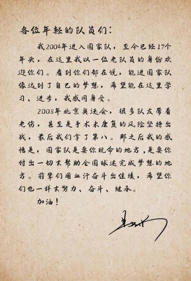 易建聯(lián)在信中回顧了自己首次入選國家隊的感受,表示自己完全能理解新隊員此刻的心情,他尤其強調了榮譽感與責任感,對這些小兄弟們說“國家隊是要你玩命的地方”,“各位年輕隊員們,我2004年進入國家隊,至今已經有17個年頭,在這里我以一位老隊員的身份歡迎你們??吹侥銈兌荚谡f,能進國家隊像達到了自己的夢想,希望能在這里學習、進步,我感同身受。2008年北京奧運會,很多隊友帶著老傷,甚至是手術未康復的風險堅持出戰(zhàn),最后我們拿到了第八。那之后我的感悟是,國家隊是要你玩命的地方,是要你付出一切去幫助全國球迷完成夢想的地方。前輩們用血汗奮斗出佳績,希望你們也一樣去努力、奮斗、繼承?!?/span>