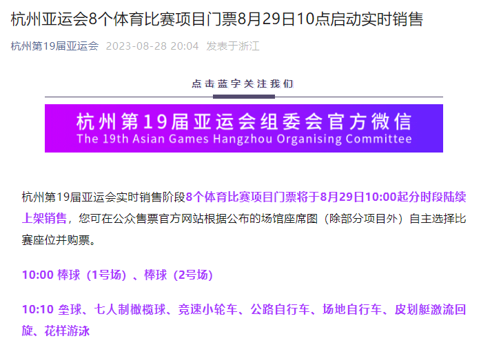 杭州第19屆亞運(yùn)會(huì)實(shí)時(shí)銷售階段8個(gè)體育比賽項(xiàng)目門票將于8月29日10:00起分時(shí)段陸續(xù)上架銷售,您可在公眾售票官方網(wǎng)站根據(jù)公布的場(chǎng)館座席圖(除部分項(xiàng)目外)自主選擇比賽座位并購(gòu)票。