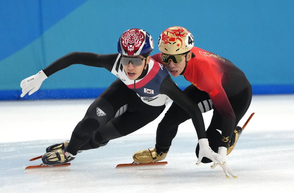 2月9日,中國隊選手林孝埈(右)、韓國隊選手樸智元在比賽中發(fā)生身體碰撞。新華社記者 顏麟蘊 攝