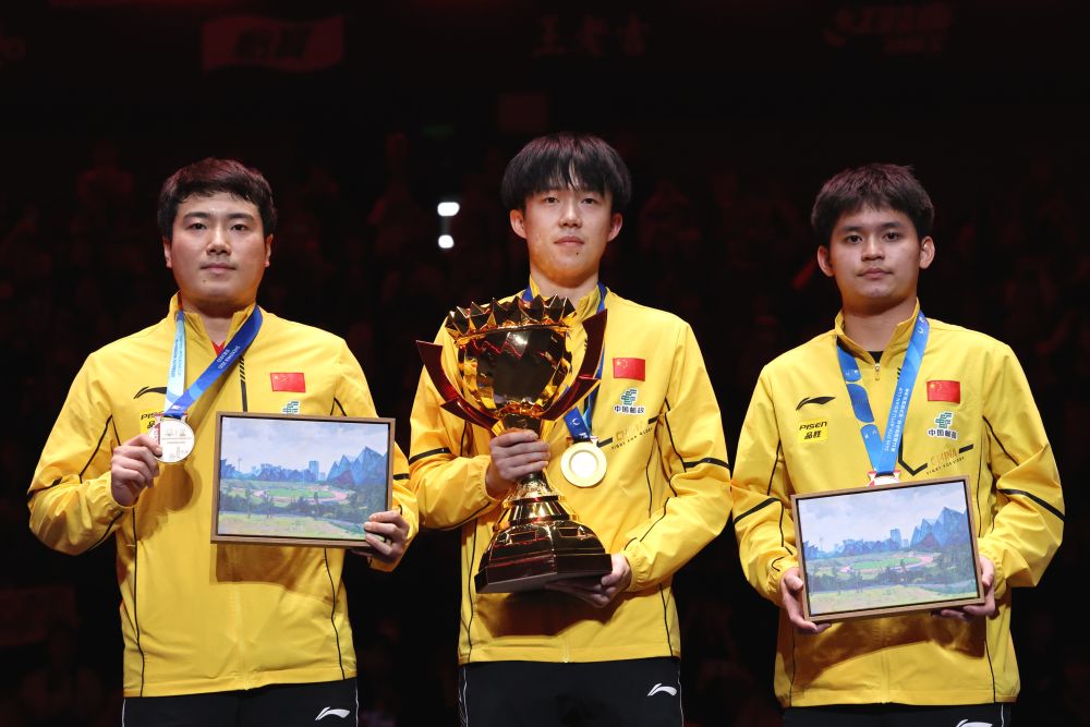 2月23日,冠軍王楚欽(中)、亞軍梁靖崑(左)和季軍林詩棟在頒獎儀式上合影。當(dāng)日,在廣東深圳舉行的第34屆國際乒聯(lián)-亞乒聯(lián)盟亞洲杯男子單打決賽中,中國選手王楚欽4比0戰(zhàn)勝隊(duì)友梁靖崑,奪得冠軍。新華社記者 梁旭 攝