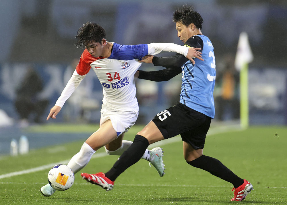 3月12日,上海申花隊(duì)球員劉誠(chéng)宇(左)與川崎前鋒隊(duì)球員丸山祐市在比賽中拼搶。新華社記者 賈浩成 攝