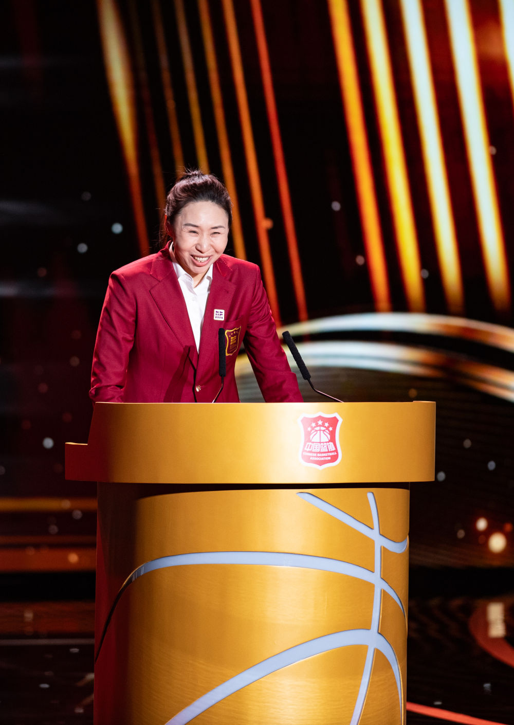 3月23日,中國(guó)籃球名人堂入堂人物“杰出女運(yùn)動(dòng)員”苗立杰在入堂儀式上演講。新華社記者 陳鐘昊 攝