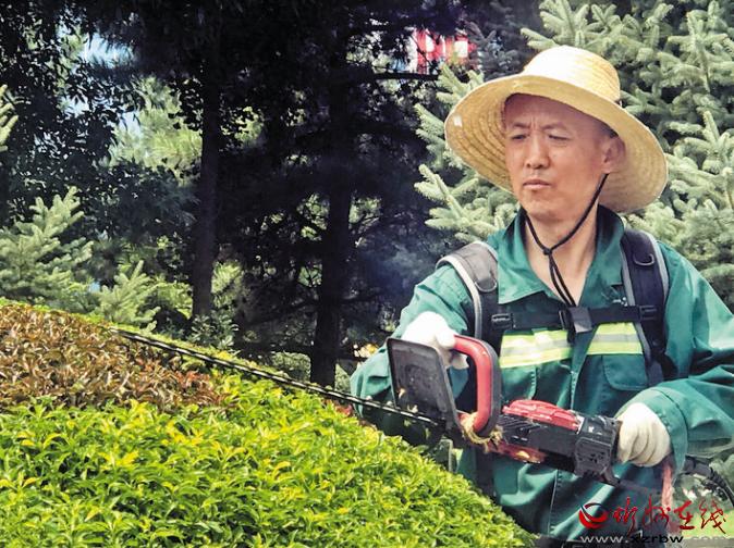 城市是我家,我來扮美它。市園林服務(wù)中心體育廣場管理辦公室張立文正在精心修剪綠植。本報記者 范 濤 攝