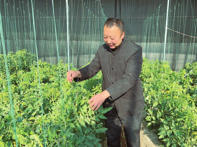陽高縣迎春蔬菜種植專業(yè)合作社負(fù)責(zé)人王學(xué)斌在育苗示范基地查看小番茄苗長勢。 本報通訊員攝