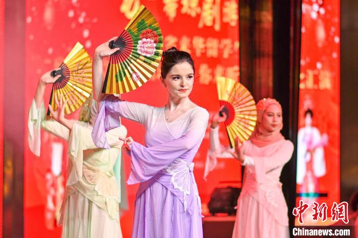 1月22日晚,海南省來華留學(xué)生“瓊韻華章之瓦唱瓊劇、你來聽”非遺匯演在??谂e行,外國(guó)留學(xué)生表演折扇舞。 肖若洋 攝