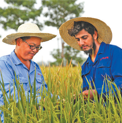 在巴基斯坦東部旁遮普省首府拉合爾西南郊,中國(guó)農(nóng)業(yè)專家(左)與育種站助理研究員瓦西姆·瓦希德在稻田里進(jìn)行雜交水稻選種試驗(yàn)。新華社記者 蔣 超攝