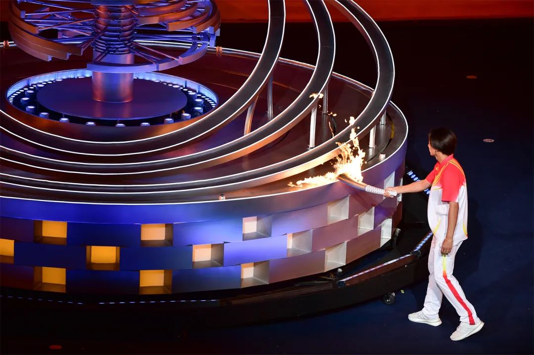 開(kāi)幕式之夜,最為激動(dòng)人心的就是點(diǎn)火時(shí)刻。在射擊世界冠軍張益梵、鄉(xiāng)村干部王春、環(huán)衛(wèi)工人孫秀蘭、大國(guó)工匠官生花、公交司機(jī)馮冰依次傳遞過(guò)后,火炬來(lái)到了最后一棒火炬手、北京冬奧會(huì)冠軍蘇翊鳴的手中。主火炬塔點(diǎn)火裝置以山西民俗“旺火”為設(shè)計(jì)依據(jù),采用清潔能源“微火”點(diǎn)燃的方式。蘇翊鳴手持火炬,在萬(wàn)眾矚目之下,以“微火”點(diǎn)“旺火”,歷史、現(xiàn)在與未來(lái),在這一刻融匯賡續(xù)。