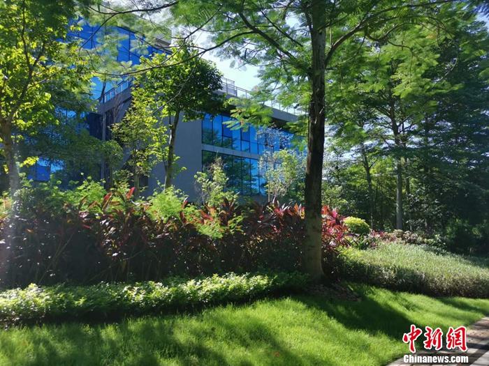 海南生態(tài)軟件園園區(qū)內(nèi)被綠樹掩映。中新網(wǎng)記者 謝藝觀 攝