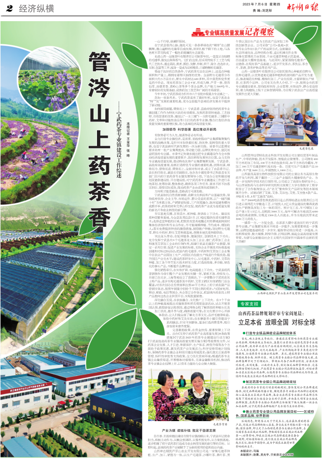 為促進寧武藥茶專業(yè)鎮(zhèn)高質(zhì)量發(fā)展,寧武縣以優(yōu)質(zhì)資源要素為支撐,堅持政府扶持、企業(yè)管理、市場運作、整合推進的原則,全縣實施包括“市場主體倍增”“創(chuàng)新能力提升”“就業(yè)富民賦能”“質(zhì)量品牌提升”“銷售市場拓展”“重大項目攻堅”和“產(chǎn)業(yè)要素保障”等在內(nèi)的七大行動,以1軸4鎮(zhèn)10村為承載主體,產(chǎn)銷緊密銜接,三產(chǎn)深度融合,縱向延鏈和橫向成群并舉,藥茶藥材和功能食品互促,推動藥茶產(chǎn)業(yè)由成型向成勢躍升。