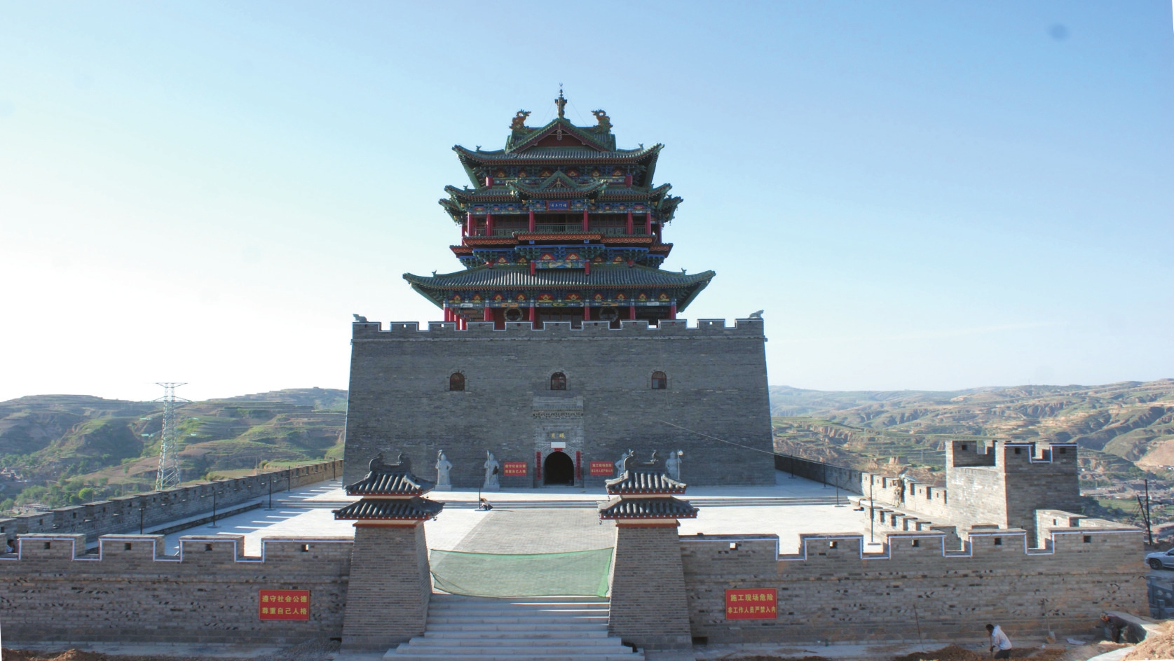 2011年至2012年,護城樓于原址復(fù)建為鋼筋混凝土仿古建筑。新建城堡南北長70米、東西寬36米,堡東開一拱門,外包磚,內(nèi)填素土并夯實,城墻上砌筑垛口。護城樓為方形,通高28.8米,其中墩臺高12米、寬28米;樓身高19米、寬20米。