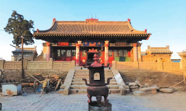 東關關帝廟位于原平市崞陽鎮(zhèn)東關村,距崞陽城東門外約100米。始建年代不詳,據(jù)正殿梁架題記載,清咸豐三年(1953)重修,現(xiàn)存建筑為清代遺構。東西長25.5米,南北寬87米,占地面積2218平方米。坐北朝南,二進院落布局,中軸線建有影壁、大門、正殿和圣母殿,兩側(cè)為東西配殿。正殿磚砌臺基,前設月臺,其上三面設勾欄、望柱,欄上雕有各種花卉、如意及禽獸。殿身面寬三間,進深六椽,單檐懸山頂。七檁前后廊式構架,斗拱五踩重翹,平身科每間一攢,出45度斜拱,前檐各間均設四扇六抹萬字紋格扇門,殿內(nèi)新塑像3尊。圣母殿磚砌臺基,殿身面寬三間,進深三椽,單檐硬山頂,四檁前廊式構架。明間四扇六抹萬字紋格扇門,次間為格扇窗。殿內(nèi)新塑像3尊。廟內(nèi)存清代重修關帝廟碑3通,殘碑1通,石獅2對。1981年列為原平市(縣級)文物保護單位。2022年列為第三批市級文物保護單位。