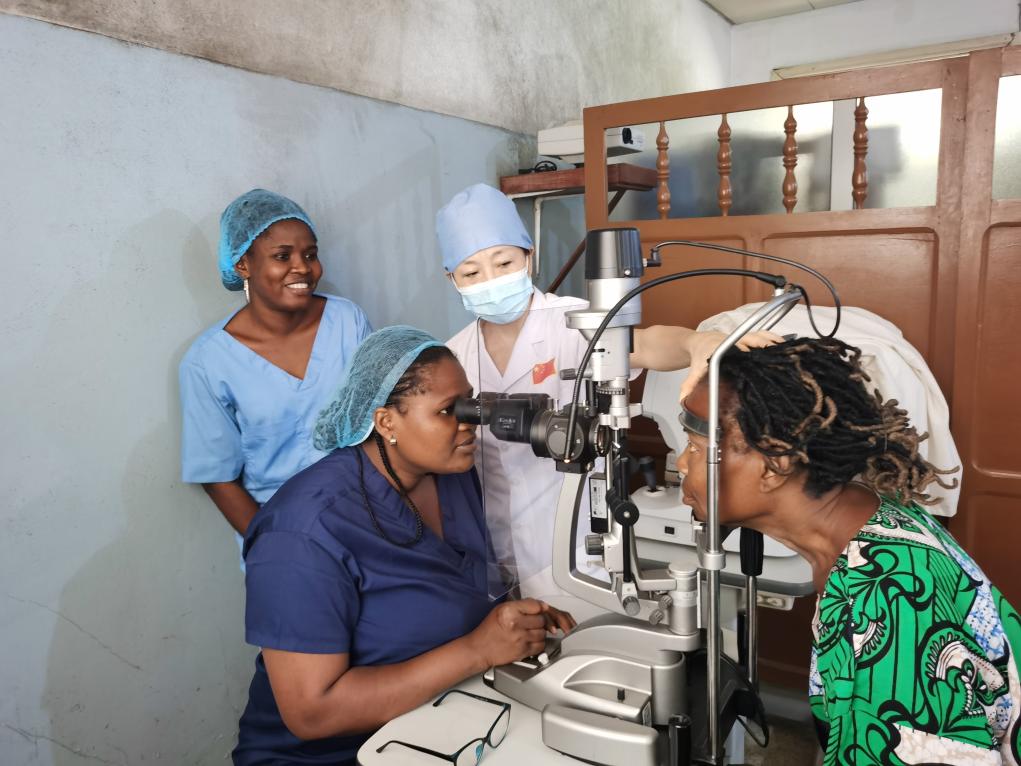 1月31日,在貝寧莫諾和庫福省中心醫(yī)院眼科診室,中國援貝寧醫(yī)療隊醫(yī)生正指導(dǎo)當?shù)刈o士為患者做檢查。
