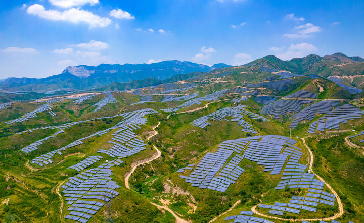 2023年7月18日,在山西省運(yùn)城市稷山縣100MW光儲一體化項(xiàng)目基地,一排排整齊的光伏板與遠(yuǎn)處的青山交相輝映。近年來,稷山縣因地制宜流轉(zhuǎn)荒山荒坡發(fā)展光伏產(chǎn)業(yè),增加農(nóng)民收入,助力鄉(xiāng)村振興。(山西省委辦公廳 供圖)