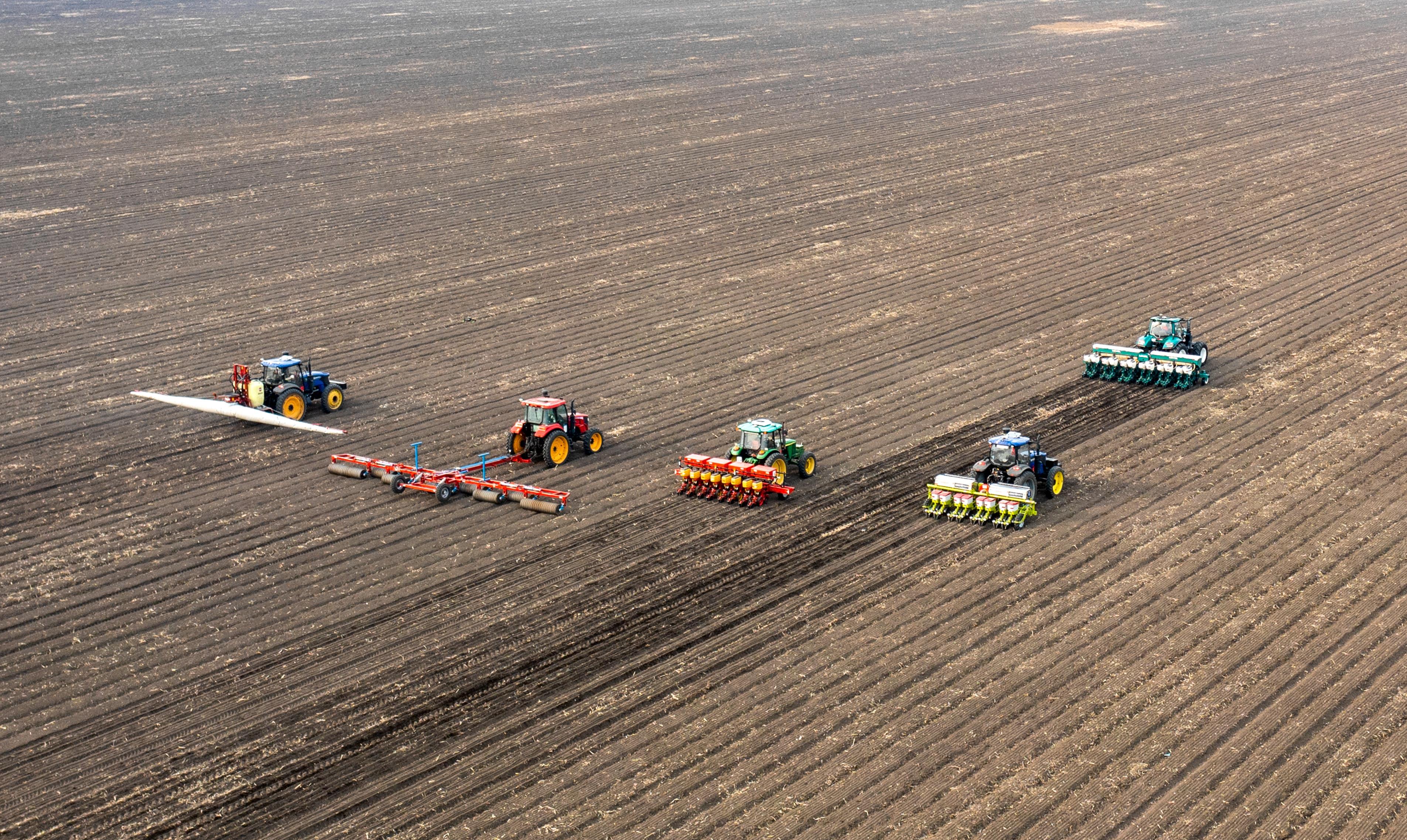 △2023年春,黑龍江雙鴨山,北大荒農(nóng)業(yè)股份友誼分公司第五管理區(qū)玉米智能機(jī)械化作業(yè)播種現(xiàn)場(chǎng)。