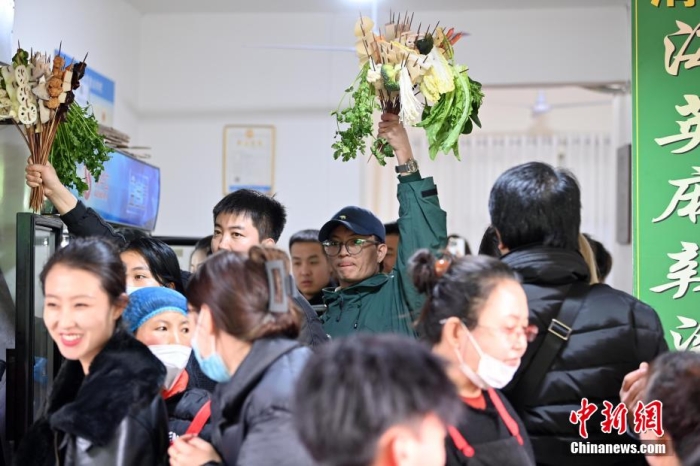 3月14日,甘肅天水,游客手舉挑選的麻辣燙食材。九美旦增 攝