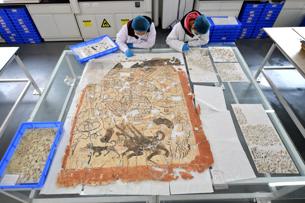 在云岡研究院壁畫文物修復(fù)室,工作人員張曉娟(左)、吳朝霞在進行壁畫修復(fù)(2021年5月9日攝)。