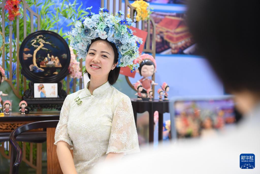 5月23日,參觀者在第二十屆文博會福建館體驗(yàn)簪花。(新華社記者 毛思倩 攝)