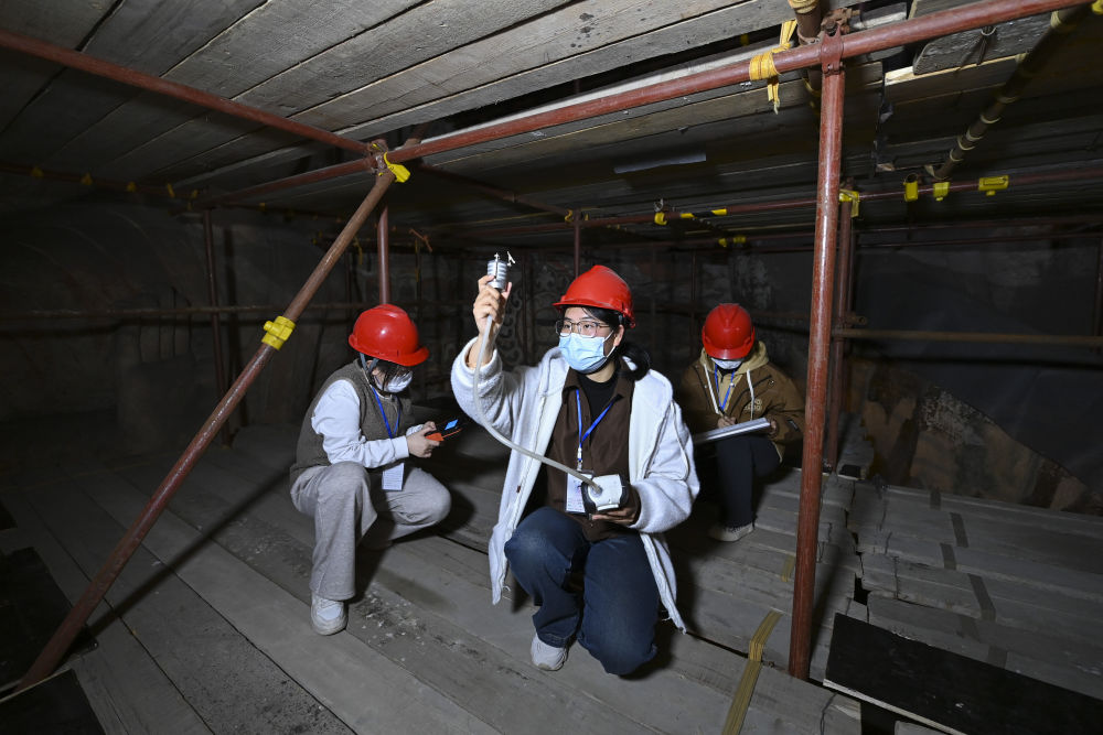 4月15日,來自中國石窟文化聯(lián)合研究生院的山西大學(xué)博士生楊亞娟(中)團(tuán)隊(duì)在云岡石窟進(jìn)行石窟氣溶膠單顆粒采樣。