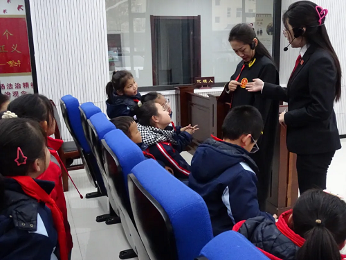 在審判法庭,法院干警深入淺出地向?qū)W生們介紹了法庭的分設(shè)區(qū)域、庭審流程、訴訟參與人、法槌起源和具體的使用方法。通過(guò)互換角色的“沉浸式”體驗(yàn),法律不僅僅是教科書(shū)中枯燥無(wú)味的文字,法庭的莊重與法律的嚴(yán)謹(jǐn)已化作一幅幅生動(dòng)的畫(huà)面,深深烙印在他們的記憶中。