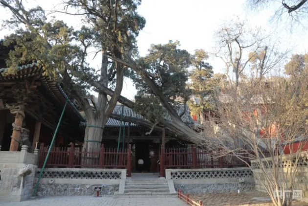 三千年晉祠的“見證者”——周柏。周柏長于圣母殿右側,18米長的周柏向南傾斜生長,被另一株古柏所支撐,樹葉披覆在圣母殿頂,樹干粗壯,得幾人才能合抱,像一條橫臥的巨龍,因此有“臥龍柏”之美譽。經(jīng)科學測定,此樹已有二千九百九十多歲。在晉祠,樹齡在千年以上的蒼松、翠柏、古槐等尚存二十余株,它們和古柏一起見證著晉祠的悠悠歷史。