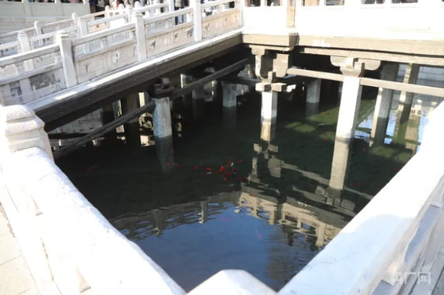 中國最早的水陸立交橋——魚沼飛梁。魚沼飛梁西依圣母殿,東鄰獻殿,初建在北魏之前。飛梁的形式古樸,橫跨于魚沼之上,借以觀賞景物,南北東西四面伸長,如鳥之振翼欲飛狀,是中國少有的一種十字橋梁形式,被譽為中國最早的水陸立交橋。