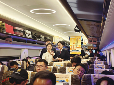 4月22日一早,在太原開往北京的書香列車上,山西晚報記者看到了這樣一幕。車廂內(nèi),兩側(cè)車窗、行李架、衛(wèi)生間、洗漱臺等處張貼全民閱讀大會標識,營造了濃厚的活動氛圍。列車視頻和廣播循環(huán)播放全民閱讀大會宣傳片,介紹大會概況及“書香列車”情況。幾名年輕乘客圍在列車餐吧臺增設(shè)的“讀書角”,選取自己喜歡的讀物。列車工作人員利用流動小車,送書到車廂,為旅客提供圖書借閱服務(wù)。在車廂兩端、每個座位頭枕巾上張貼、印刷全民閱讀大會主題海報和“書香列車云閱讀”二維碼,不少旅客掃碼開始免費聽書、看書。
