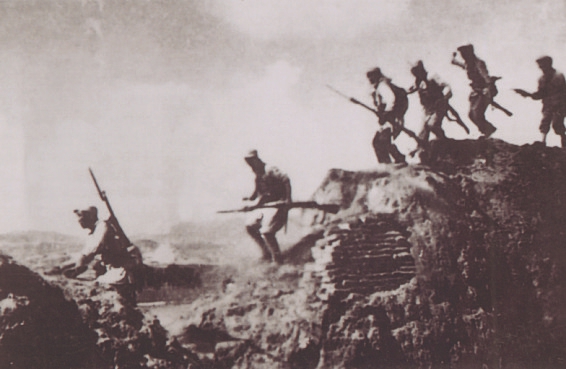 圖12 1938年春,晉西北抗日根據(jù)地軍民打退日軍的五路圍攻,收復寧武、神池等7座縣城。圖為部隊在收復寧武縣城戰(zhàn)斗中。