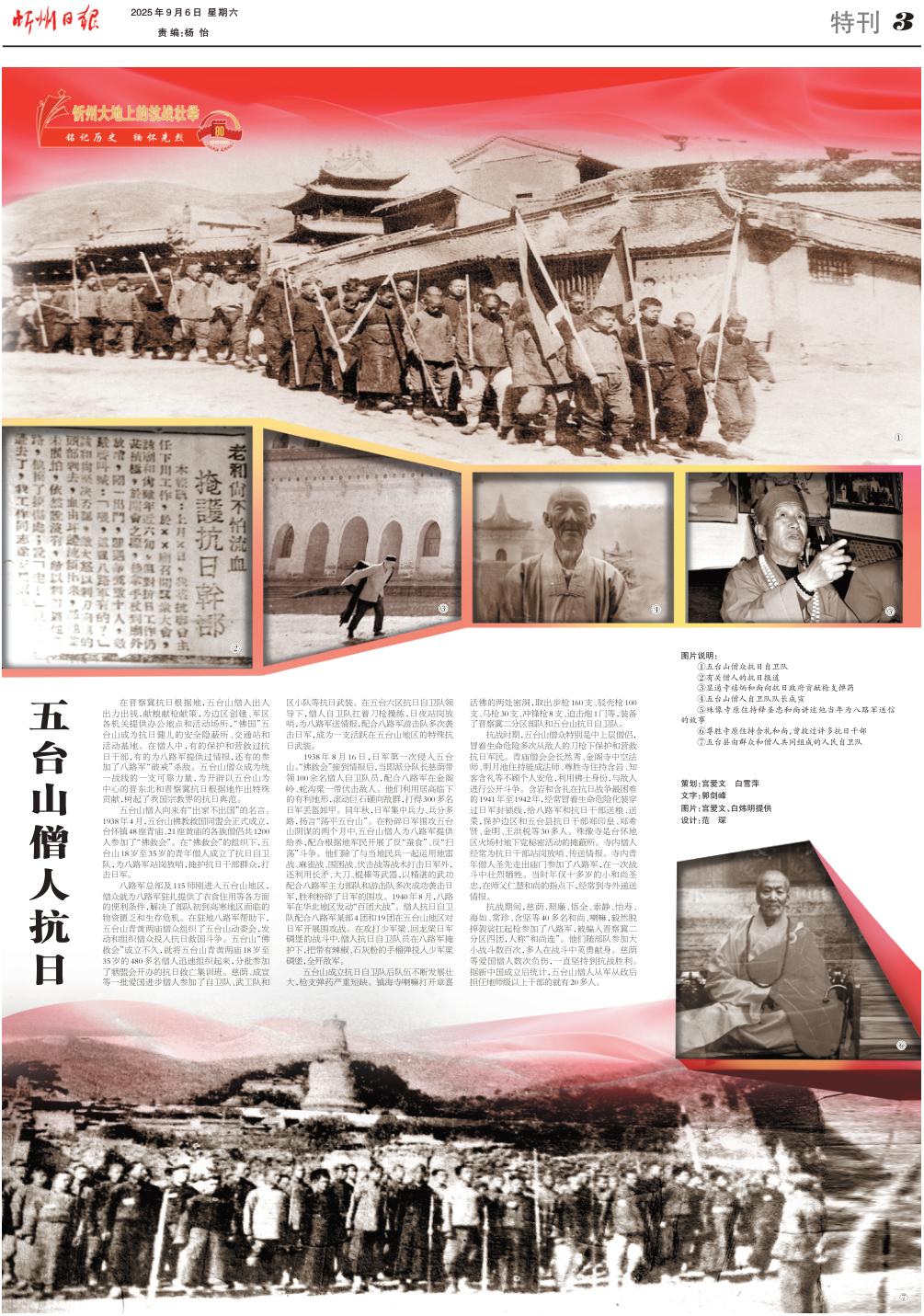 1938年8月16日,日軍第一次侵入五臺山?!胺鹁葧苯拥角閳?bào)后,當(dāng)即派分隊(duì)長慈蔭帶領(lǐng)100余名僧人自衛(wèi)隊(duì)員,配合八路軍在金閣嶺、蛇溝梁一帶伏擊敵人。他們利用居高臨下的有利地形,滾動(dòng)巨石砸向敵群,打得300多名日軍丟盔卸甲。同年秋,日軍集中兵力、兵分多路,揚(yáng)言“蕩平五臺山”。在粉碎日軍圍攻五臺山陰謀的兩個(gè)月中,五臺山僧人為八路軍提供給養(yǎng),配合根據(jù)地軍民開展了反“蠶食”、反“掃蕩”斗爭。他們除了與當(dāng)?shù)孛癖黄疬\(yùn)用地雷戰(zhàn)、麻雀戰(zhàn)、圍困戰(zhàn)、伏擊戰(zhàn)等戰(zhàn)術(shù)打擊日軍外,還利用長矛、大刀、棍棒等武器,以精湛的武功配合八路軍主力部隊(duì)和游擊隊(duì)多次成功襲擊日軍,勝利粉碎了日軍的圍攻。1940年8月,八路軍在華北地區(qū)發(fā)動(dòng)“百團(tuán)大戰(zhàn)”。僧人抗日自衛(wèi)隊(duì)配合八路軍某部4團(tuán)和19團(tuán)在五臺山地區(qū)對日軍開展圍攻戰(zhàn)。在攻打少軍梁、回龍梁日軍碉堡的戰(zhàn)斗中,僧人抗日自衛(wèi)隊(duì)員在八路軍掩護(hù)下,把帶有辣椒、石灰粉的手榴彈投入少軍梁碉堡,全殲敵軍。